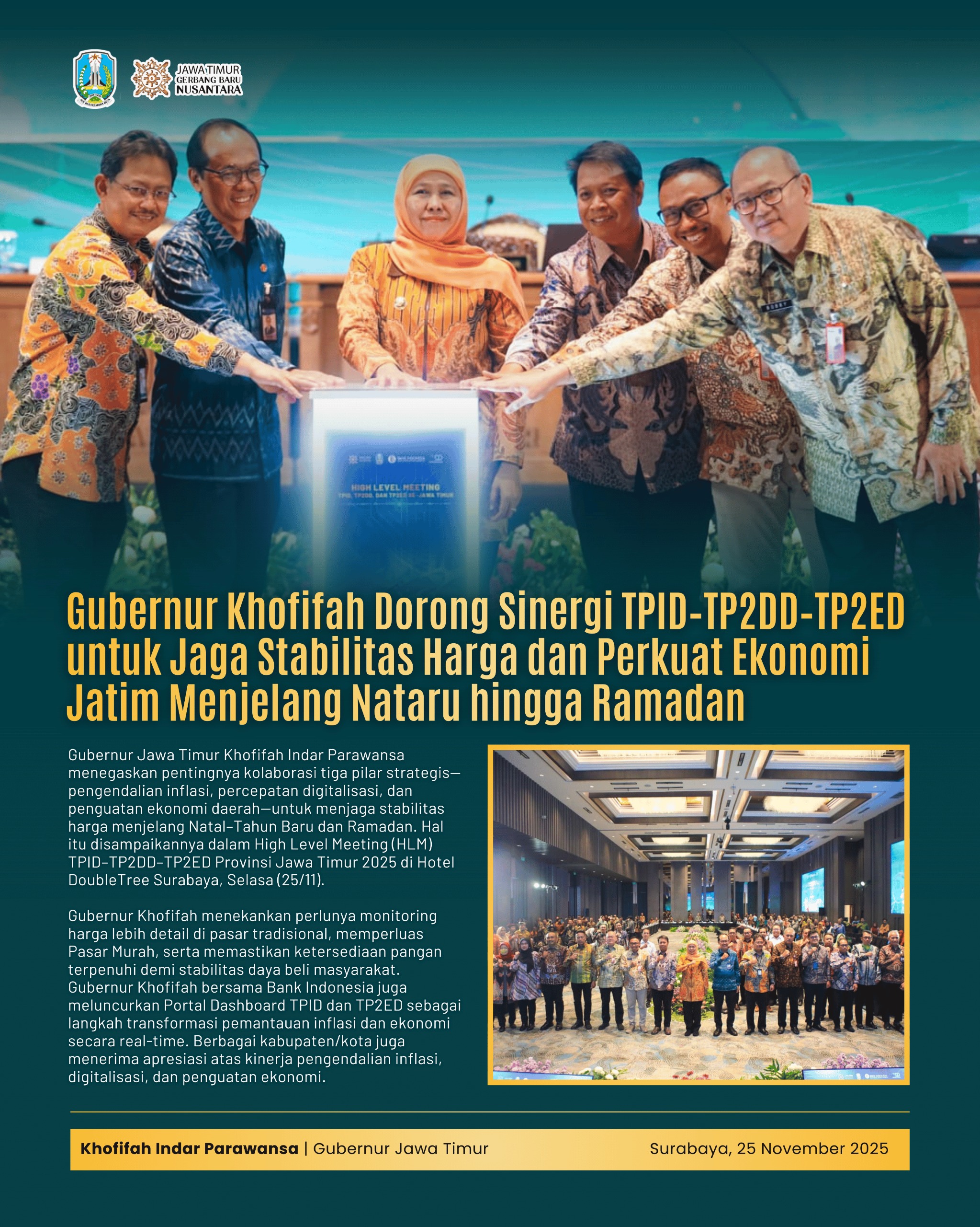 • SURABAYA, 25 NOVEMBER 2025 – Gubernur Jawa Timur Khofifah Indar Parawansa mendorong sinergi TPID (Tim Pengendalian Inflasi Daerah), TP2DD (Tim Percepatan dan Perluasan Digitalisasi Daerah) dan TP2ED (Tim Percepatan Pertumbuhan Ekonomi Daerah) untuk  Percepatan Pertumbuhan ekonomi dan menjaga stabilisasi harga serta kendalikan inflasi di  Jatim...