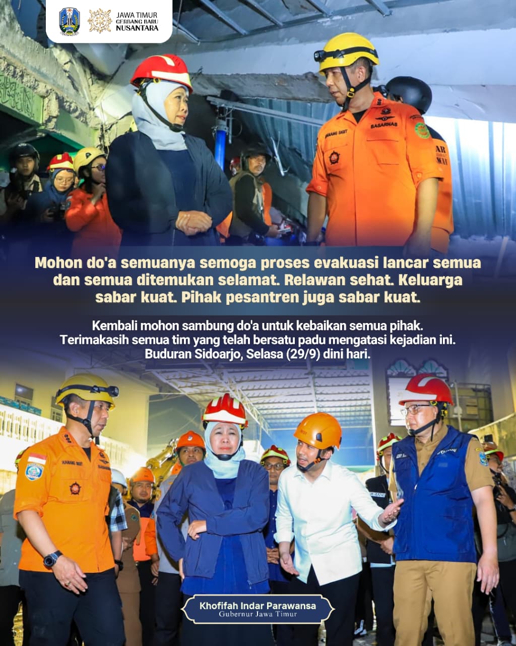 Di akhir Gubernur Khofifah juga berharap mereka yang tertimpa musibah kebakaran ini diberikan kesabaran dan kekuatan . Ia juga berdoa semoga Allah melimpahkan rizki berlipat untuk mengganti harta benda yang ikut terbakar dalam musibah tersebut.